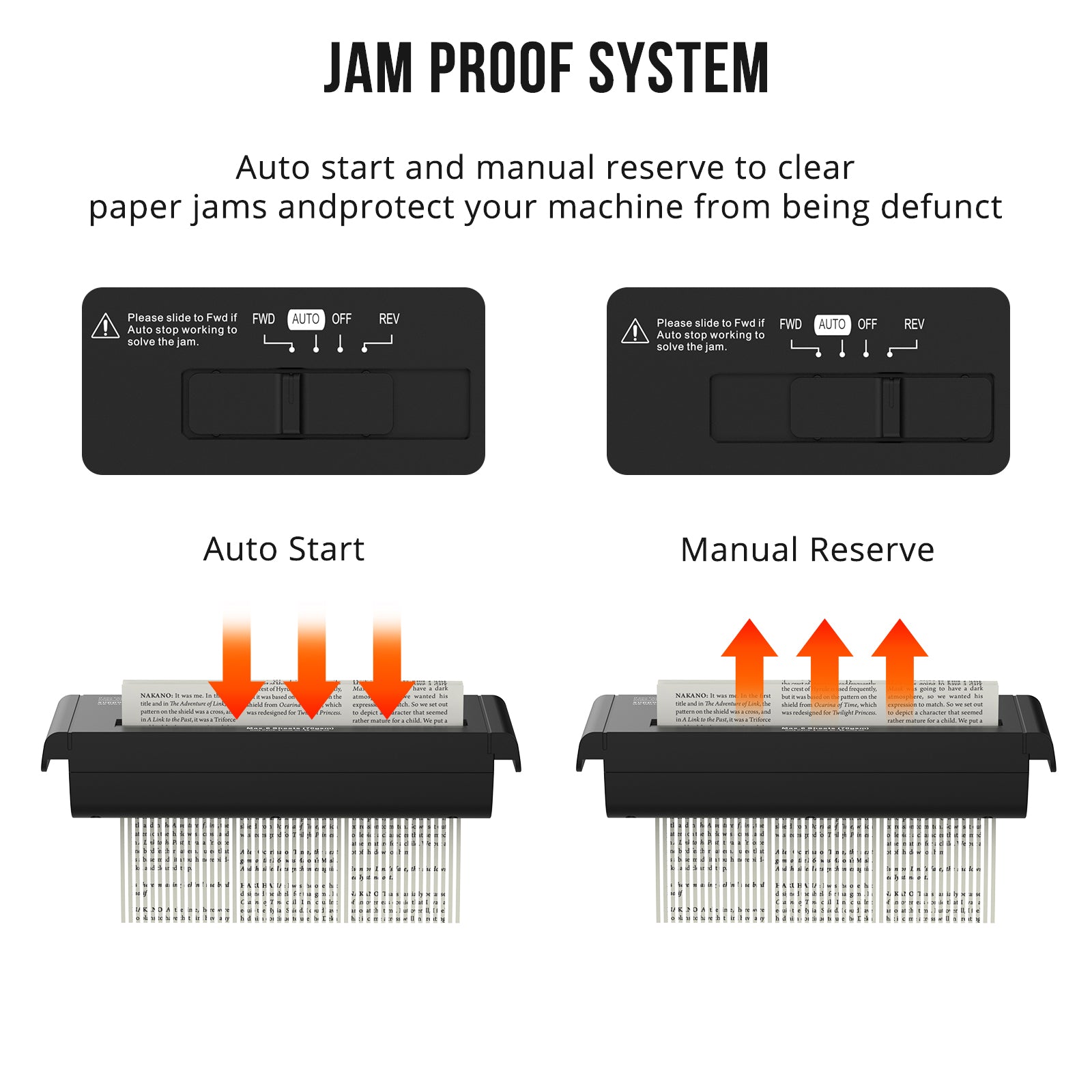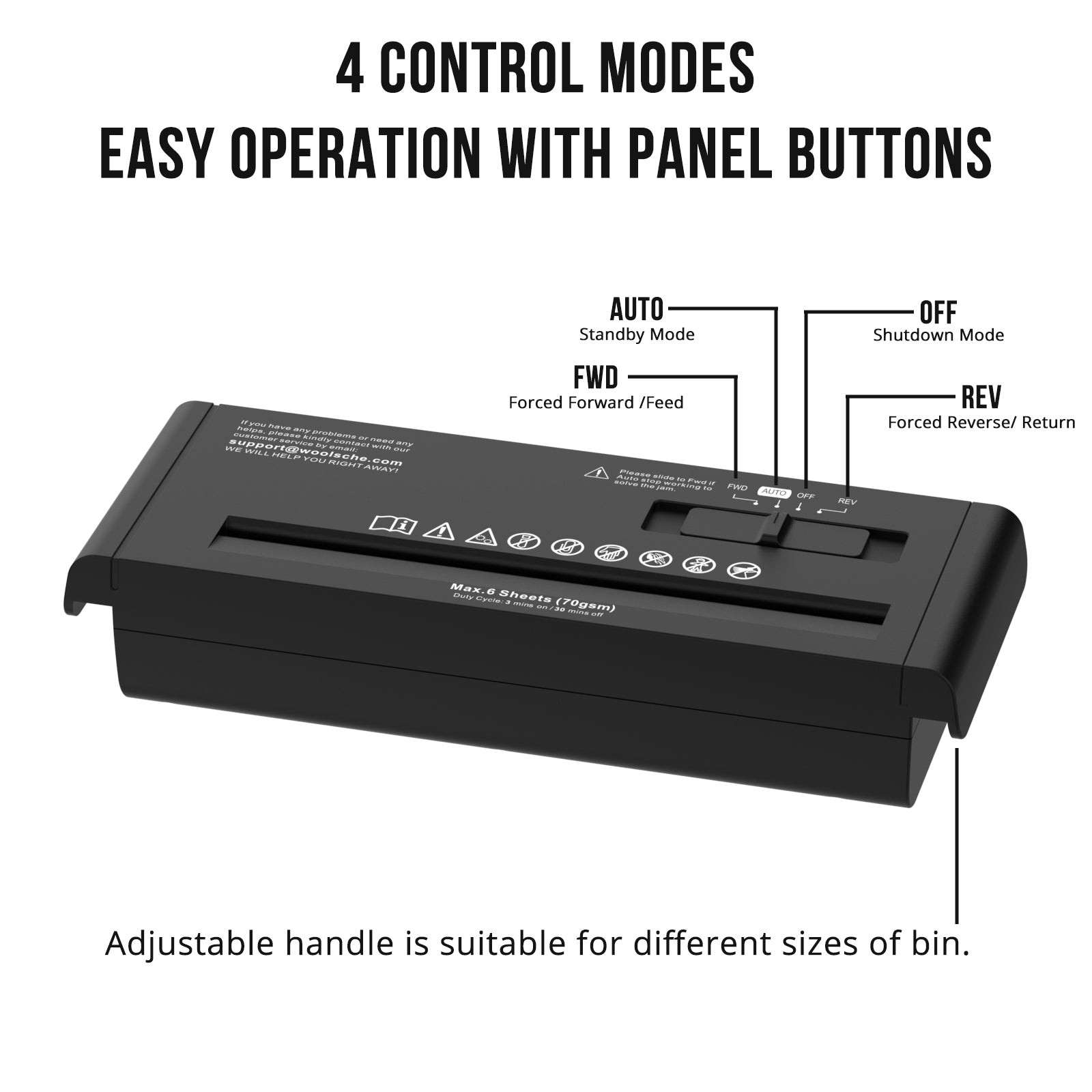 Shredder also features a 4-mode control switch (Auto/Off/Reverse/Fwd),with the reverse mode & Fwd mode helping to release any jammed paper or forced forward/ feed,enhanced shredding strength.