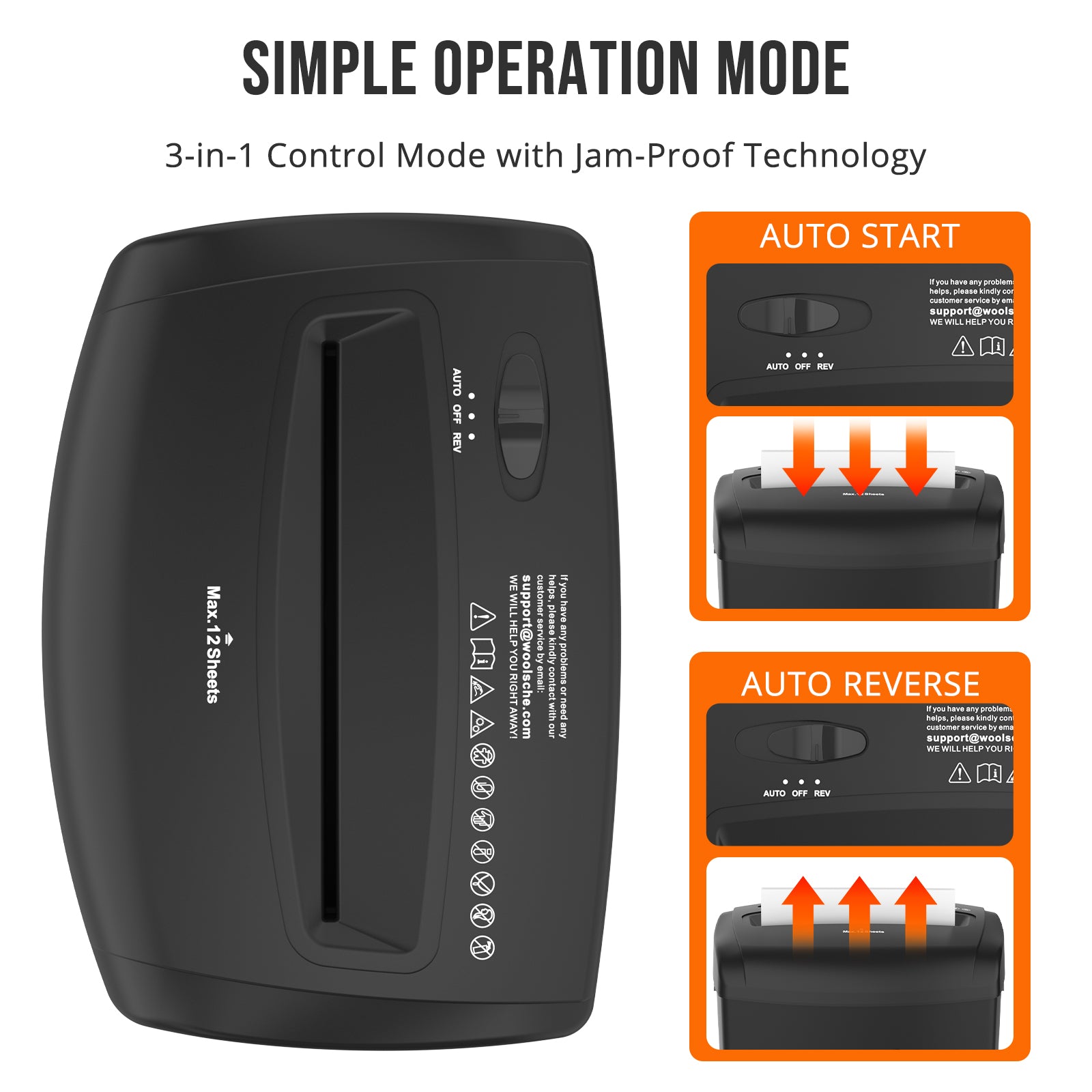 Simple Operation Mode:3-in-1 control (Auto/Off/Reverse) with jam-proof technology. Auto-start/stop saves energy, manual reverse clears jams in seconds.